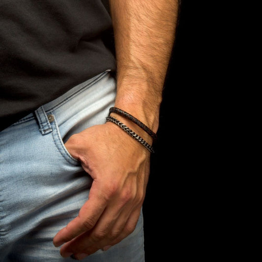 Multi Strand Leather and Stainless Steel Foxtail Chain Stacking Duo Bracelet