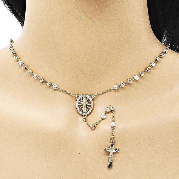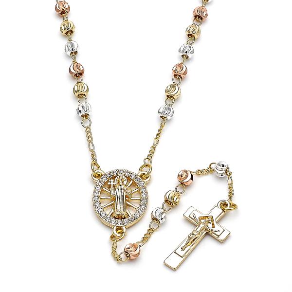This finely crafted rosary features a beautiful gold-plated design with white micro pave accents. Perfect for women of faith, it includes a San Benito and Crucifix design, measuring at 20.0 x 0.5 x 0.2 inches and weighing 13.2 grams with a thickness of 04 MM.