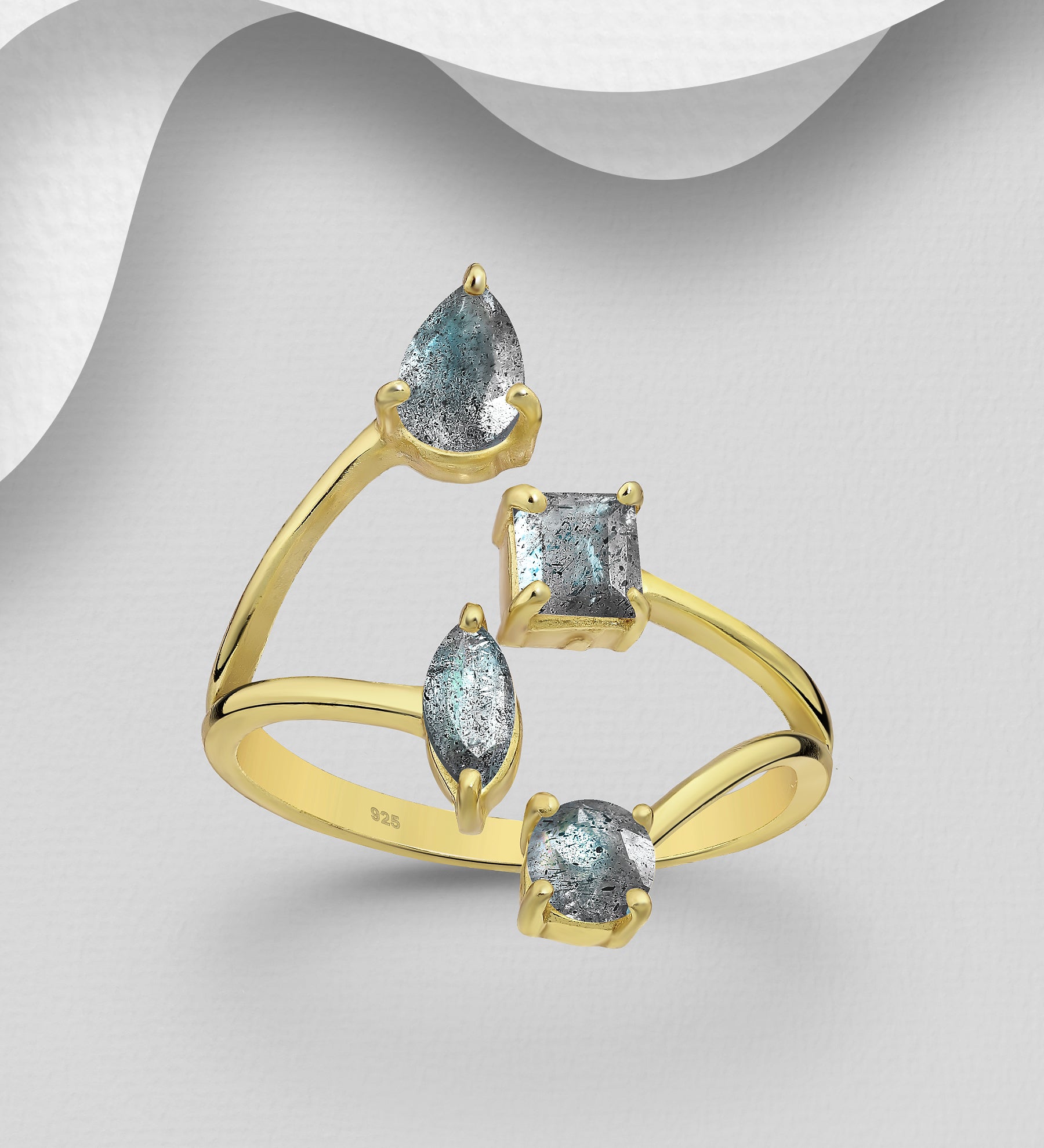 Introducing the must-have statement ring! Crafted from 925 Sterling Silver and adorned with breathtaking Labradorite, this adjustable piece exudes both sophistication and versatility. It's adorned with 0.3 Micron 18K Yellow Gold for a flawless finish and secured with a dainty prong setting. Make a statement at any event with this exquisite ring that truly captures your desires.
