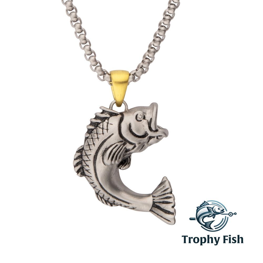 Evoke the passion of freshwater fishing with our Men's Antiqued Matte Finish Steel Largemouth Bass Pendant and Bold Box Chain. This bold pendant features a detailed silhouette of the renowned Largemouth Bass, symbolizing triumphs on the lake or river. Our Trophy Fish Collection captures the excitement of the catch with intricately crafted pendants. Made from stainless steel with an oxidized finish for enhanced detail, each piece boasts a unique gold bail accent, combining the art of fishing with exquisite jewelry design.