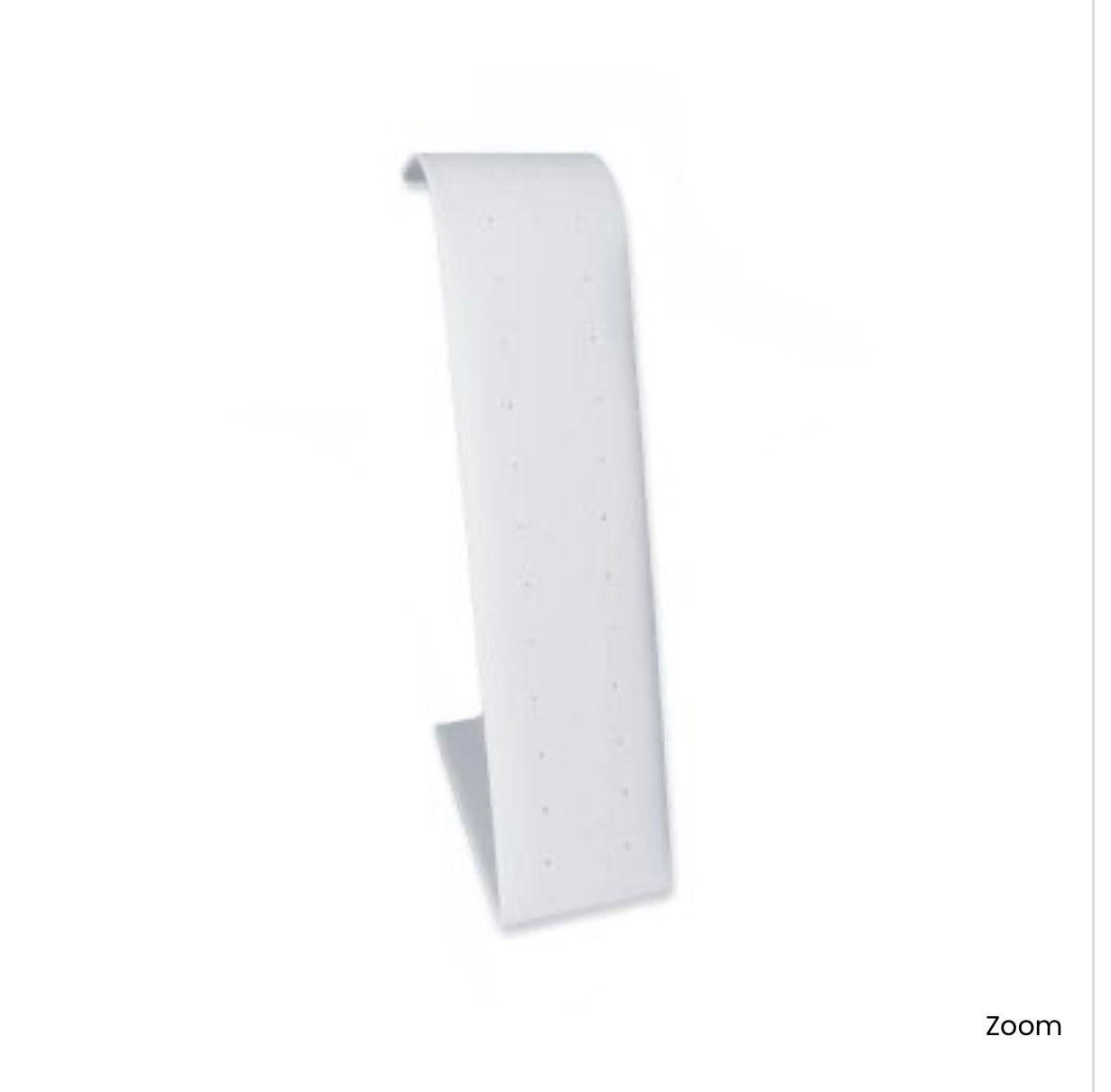 White vertical leatherette earring stud L shaped display stand. This display accommodates 12 pairs of stud earrings with its inset holes. Simply push the earring through, put on the backing and you are done!