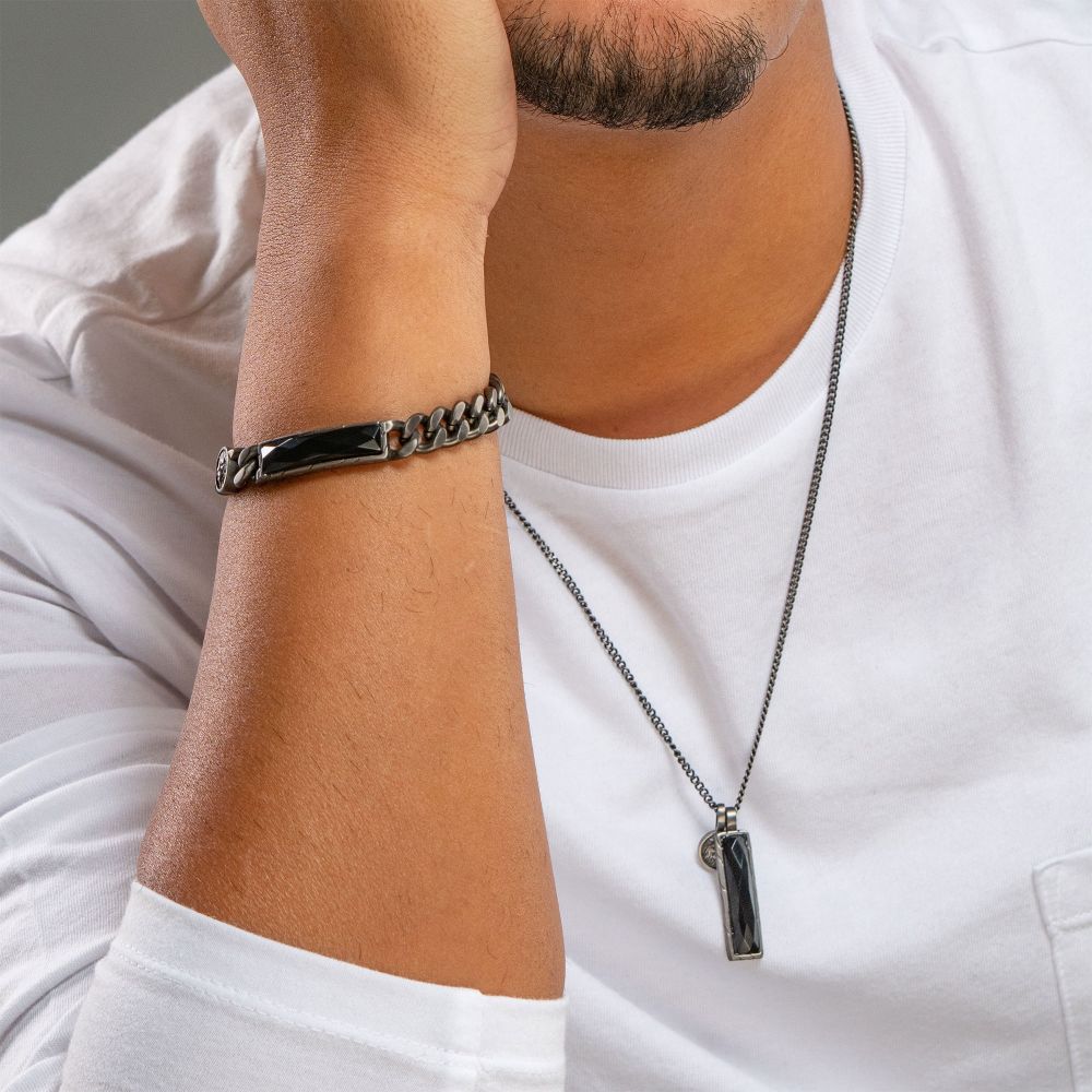 Men's Stainless Steel Matte Finish Gun Metal IP with African Lion Sigil & Faceted Black Agate Stone Double Pendants with 2.2mm Curb Chain. Pendant: 8.8mm (W) x 30.3mm (H) x 5.3mm (THK), Lion Width: 9.8mm,Height: 9.8mm,Thickness: 2.7mm, Bail Height: 6mm.