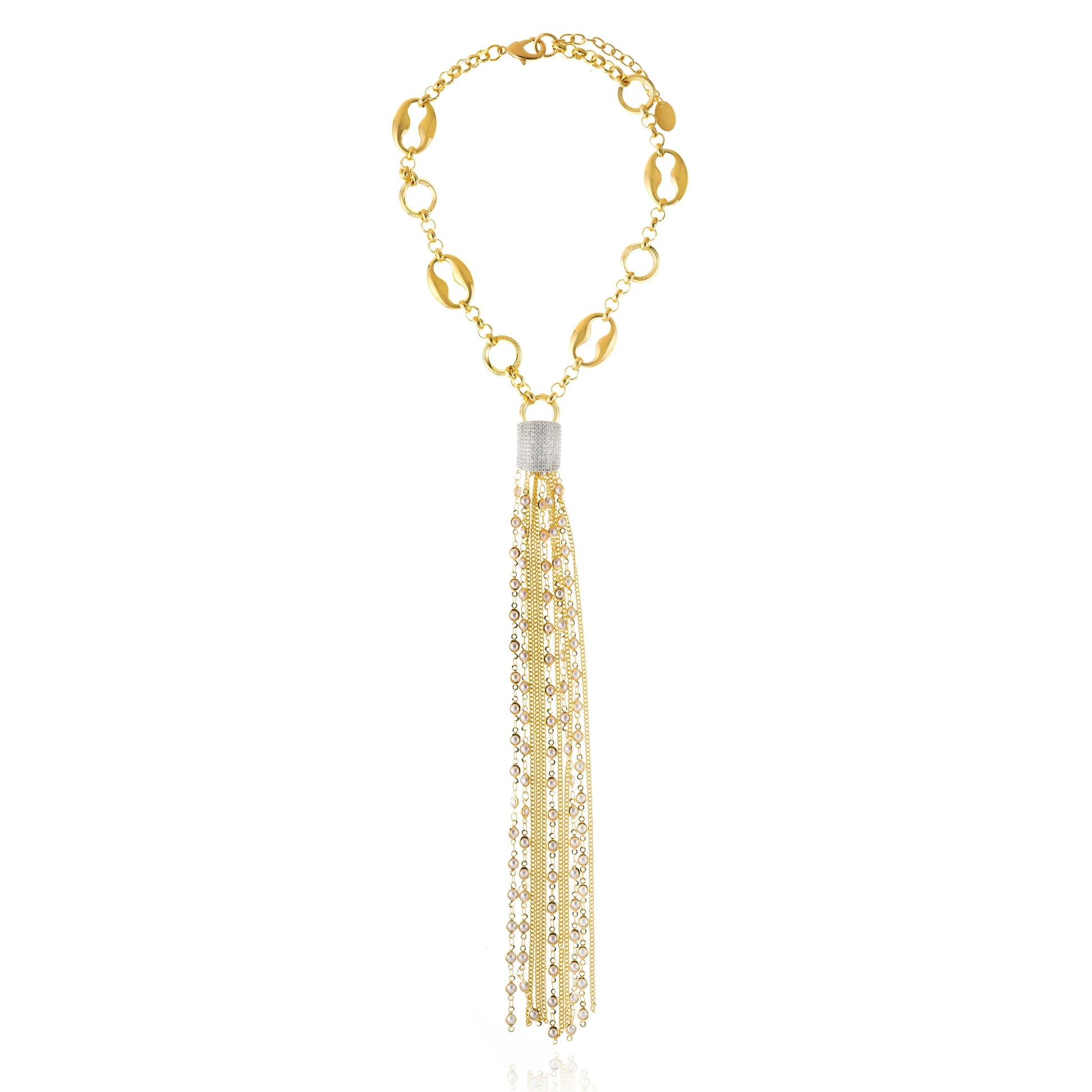 Featuring striking gold links paired with a flowing chain fringe, this necklace merges contemporary elegance with classic Italian artistry. The silver-tone cap provides a delicate contrast, enhancing the design with understated shimmer and refined sophistication.