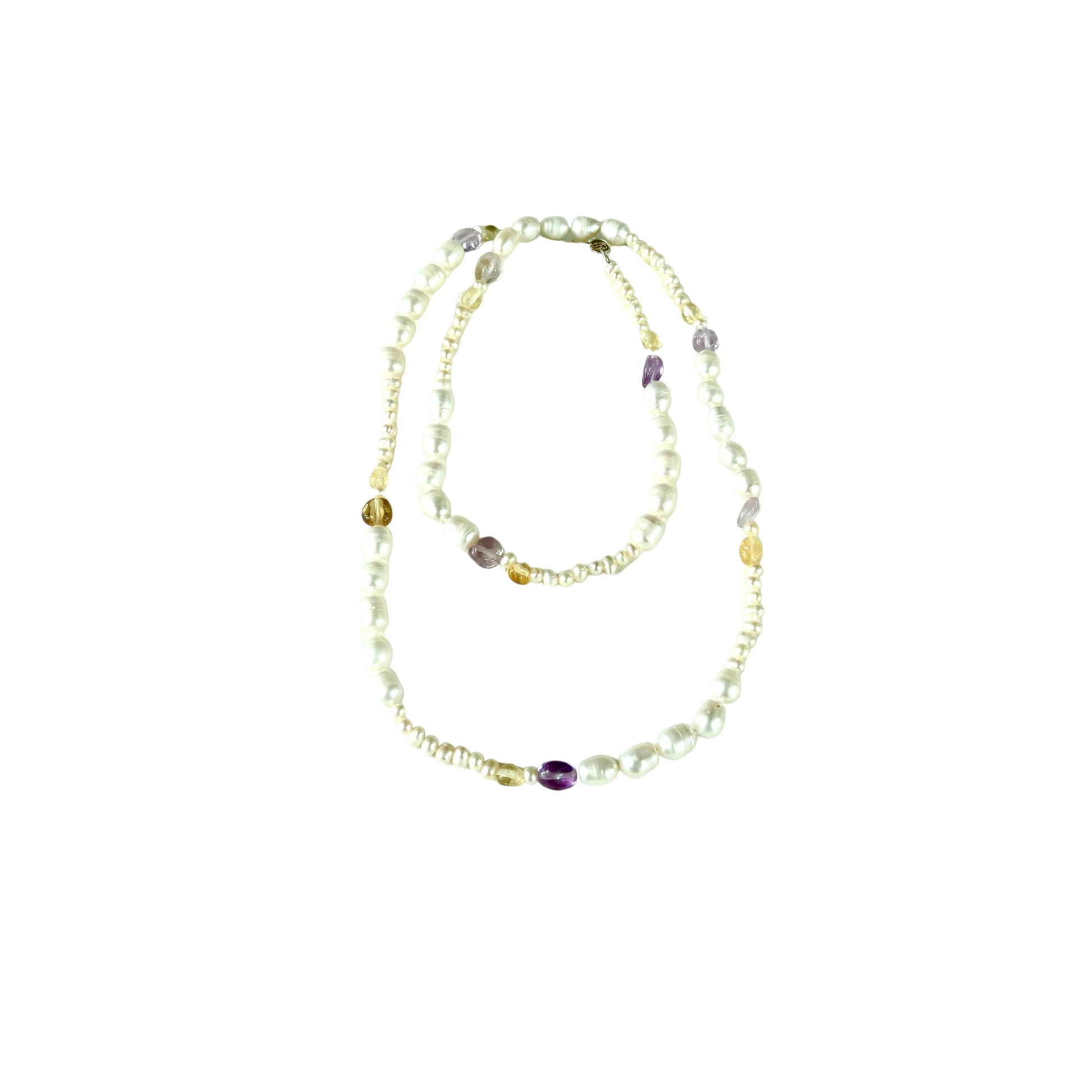 Size 36" long, Fresh pearls, amethyst and citrine stones.